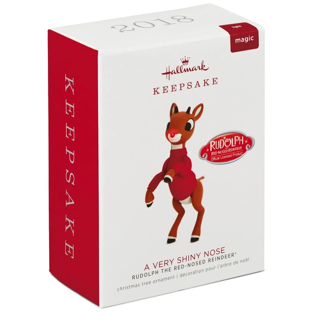 - Magic Light Christmas tree ornament. Press the button to light up Rudolph’s nose. Battery operated. Requires three (3) LR44 batteries, included.