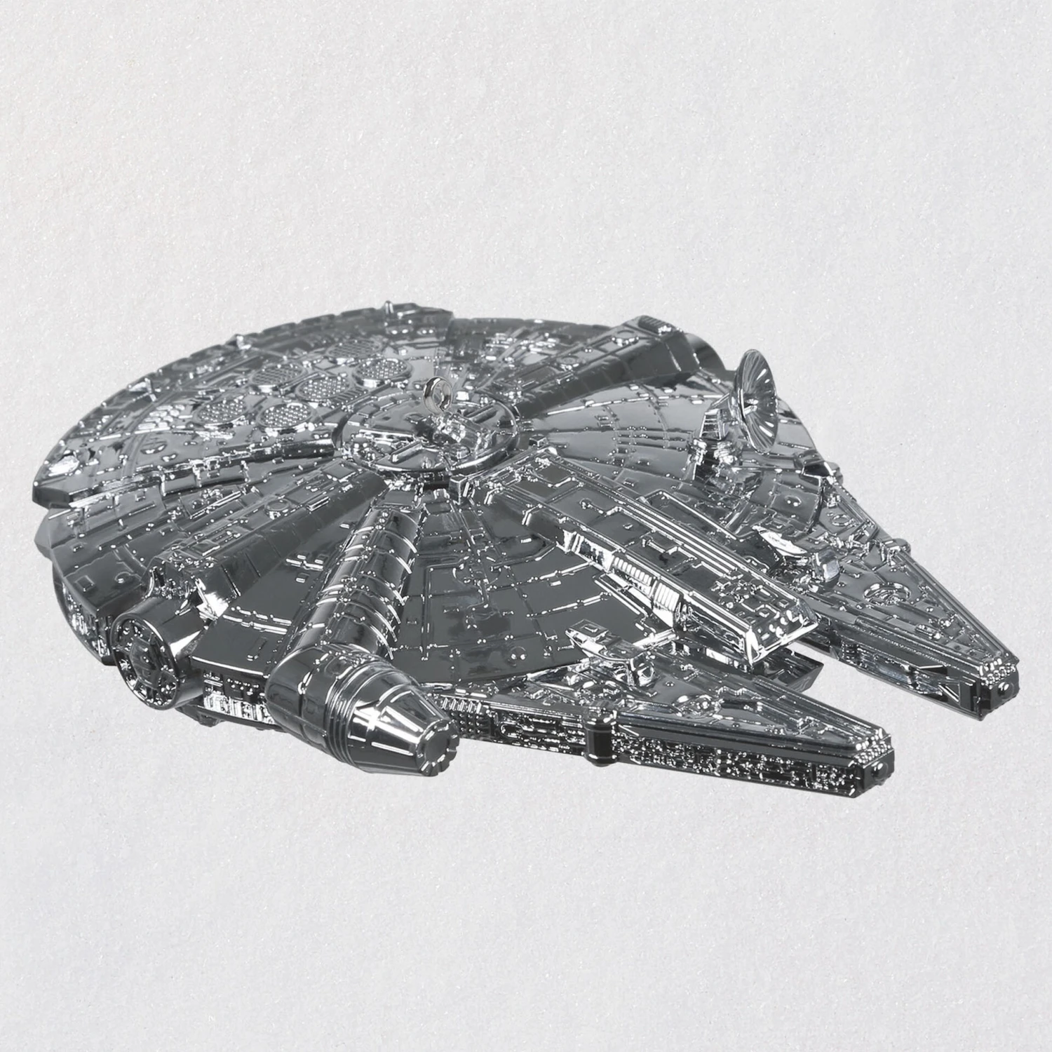 In 1996, Hallmark debuted its very first Star Wars Keepsake Ornament. Celebrate the silver anniversary of that milestone release with this premium metal Christmas tree ornament of Han Solo’s iconic Corellian freighter, the Millennium Falcon, complete with a fabulous shiny chrome finish.